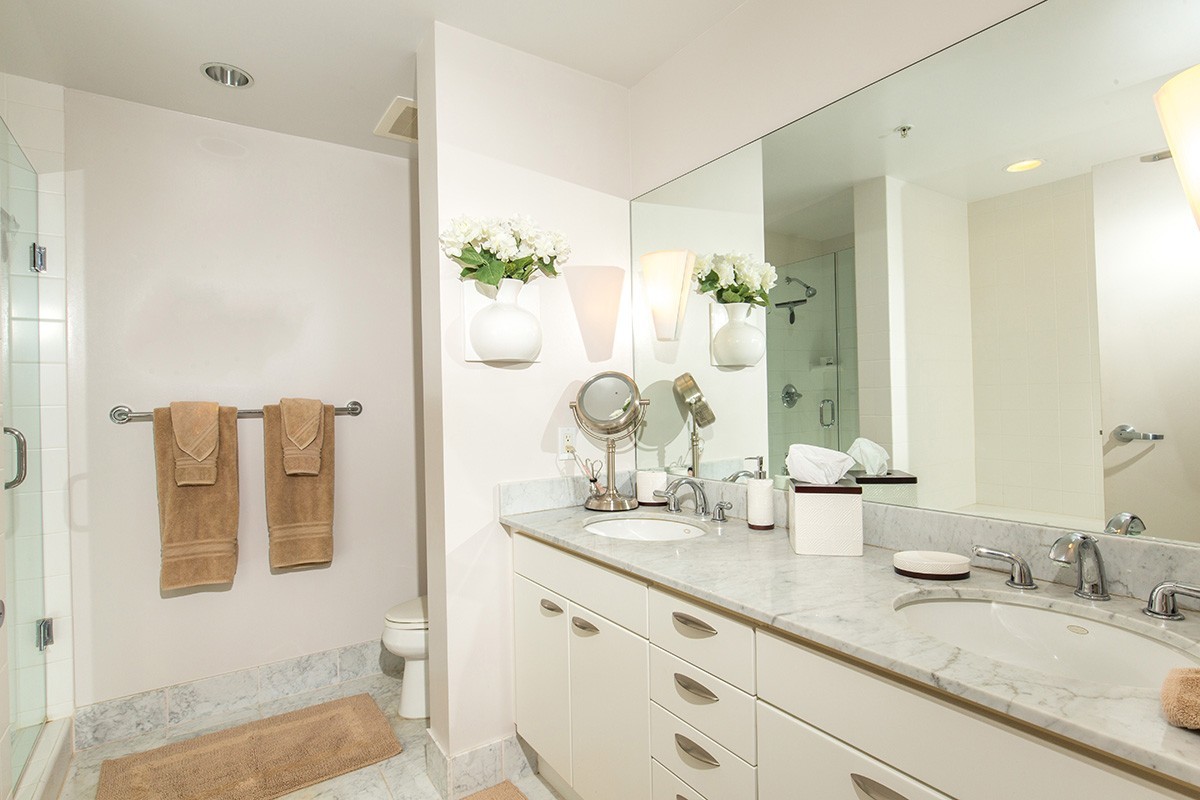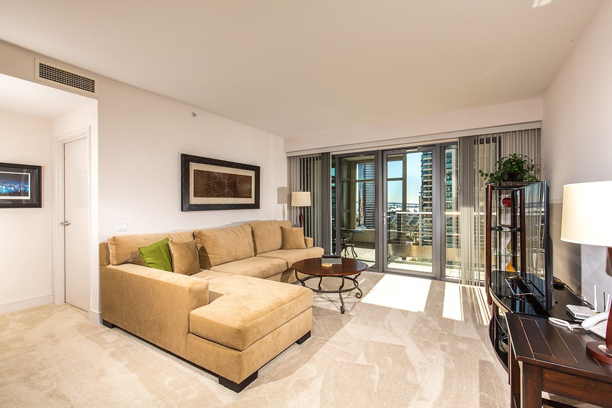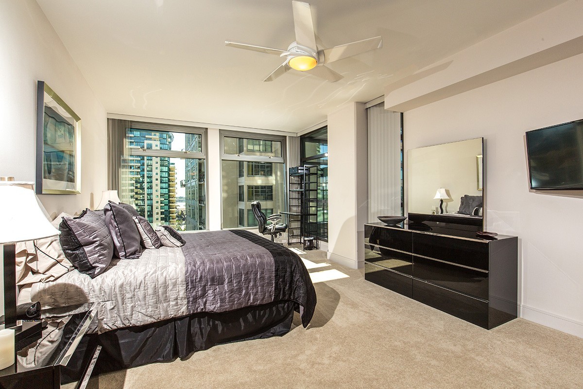 Unit comes with everything pictured. King bed in master, queen in guest room. Enjoy panoramic views from every window! The bedrooms are split and master is huge with a separate tub and shower. Views to Point Loma, Coronado Bridge, and Petco Park. Community pool, spa and exercise room. Walk to the heart of The Gaslamp and more! 1 parking space. 30 day minimum lease required. Pets considered on case by case basis and require additional deposit.