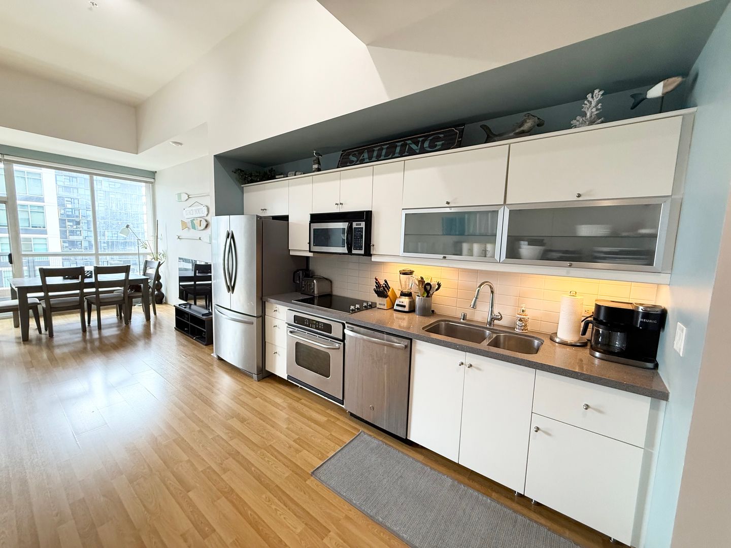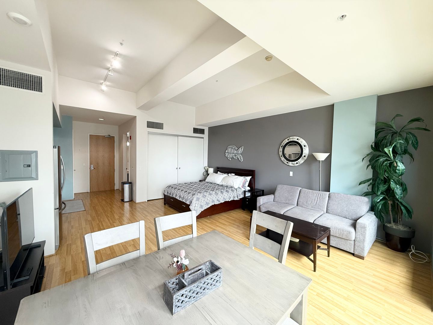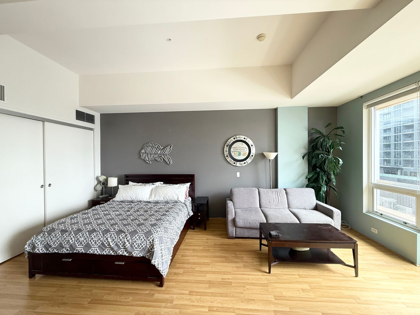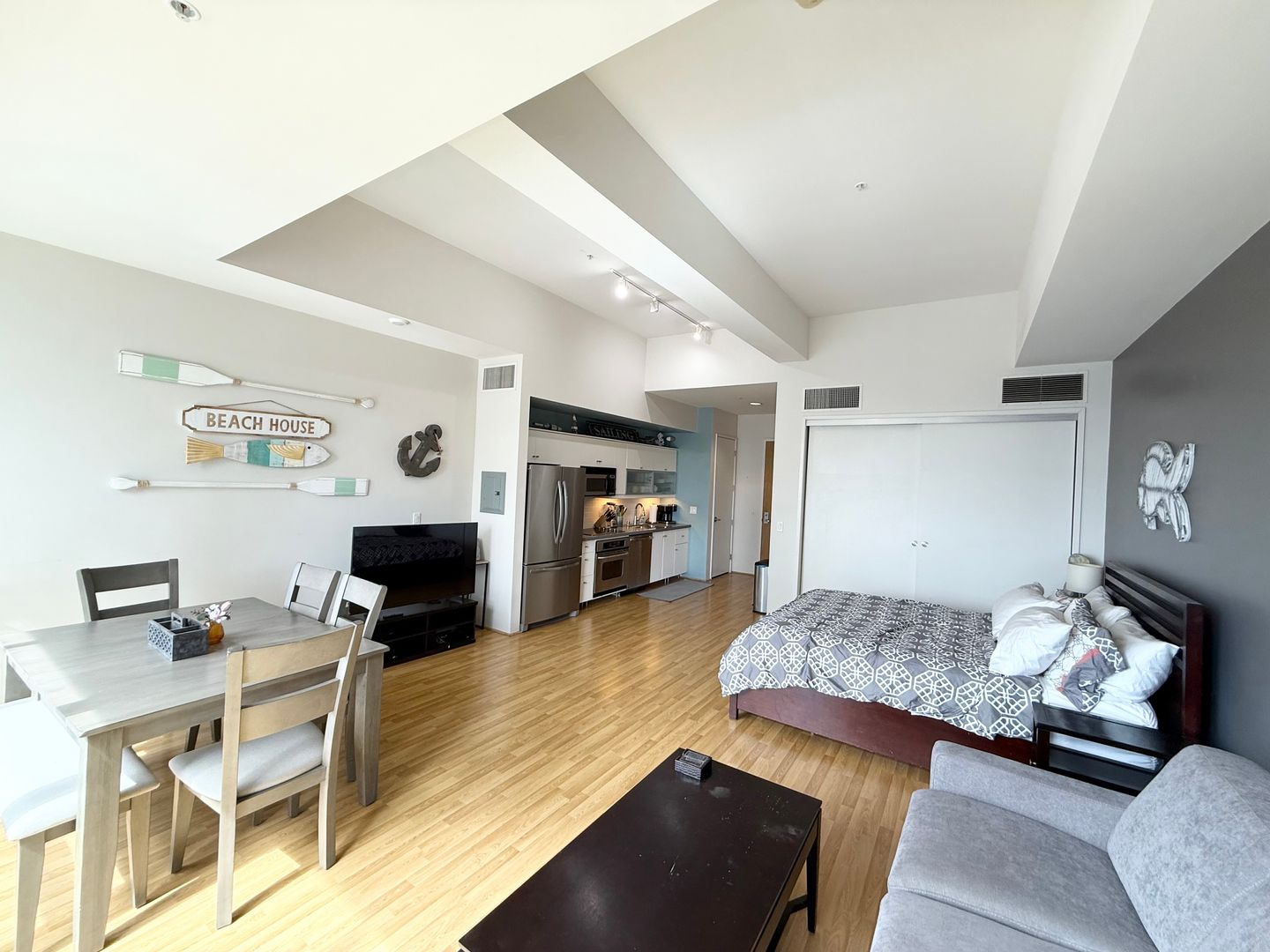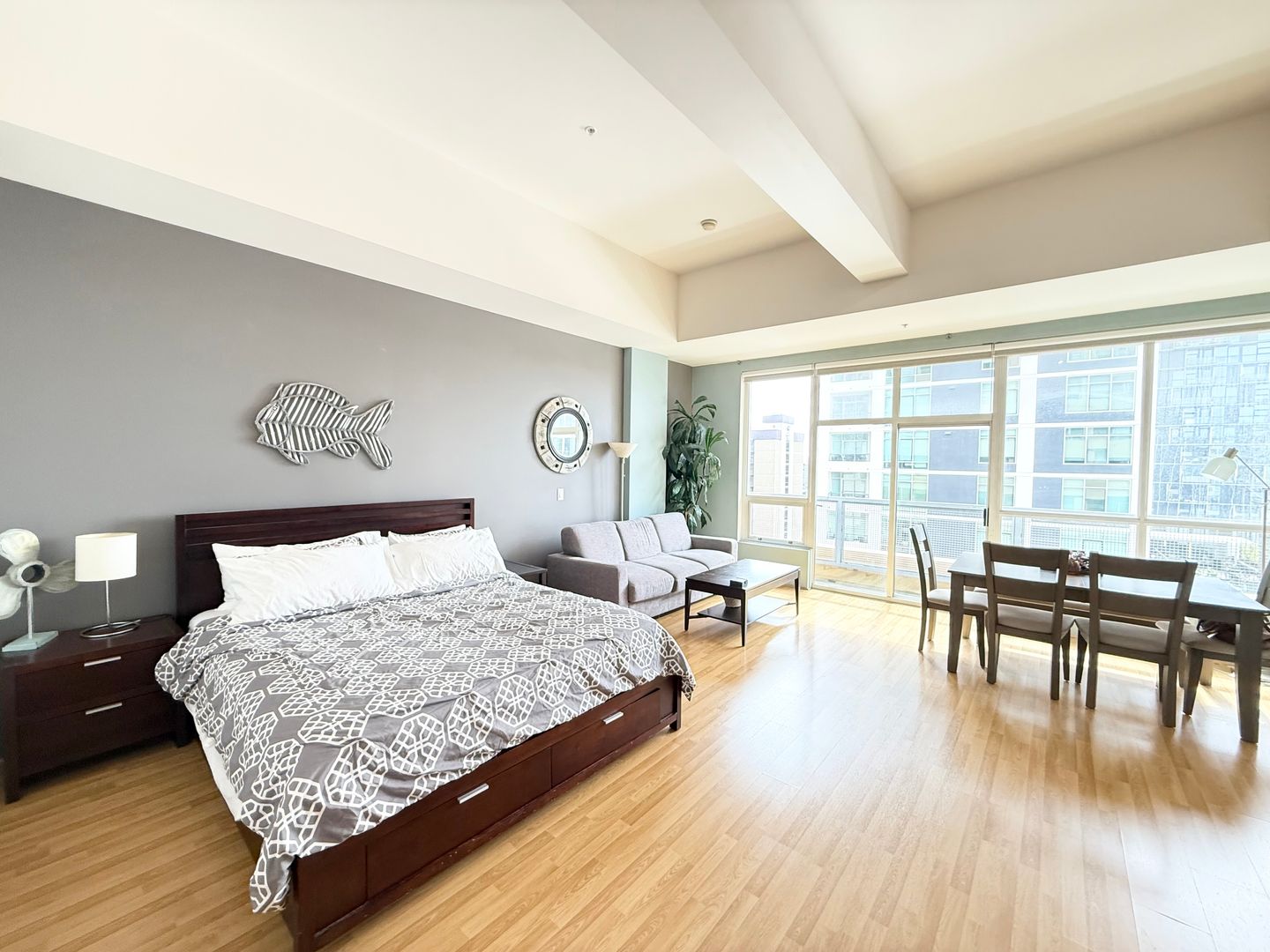 Fabulous open Loft plan with high ceilings with custom wood floors; floor to ceiling windows with City & Bay views. Stainless Steel appliances in fully equipped kitchen. New Cal-King Bed & New Queen Sofa Sleeper. Dining room table w/six chairs; New Smart TV.  Full size W/D. Spacious bathroom with tub/ shower. 1 assigned underground parking space. Pets considered on a case-by-case basis and require additional deposit. Renter’s insurance required.